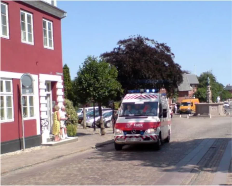 Auch ein Rettungswagen von Falk, begleitet das Radrennen.Falk war bis 2016 ein Monopolist unter den Rettungsdiensten. Nach einer EU weiten Ausschreibung 2015, kam es letztendlich zu einer Verstaatlichung des RD in der Region Südjüland