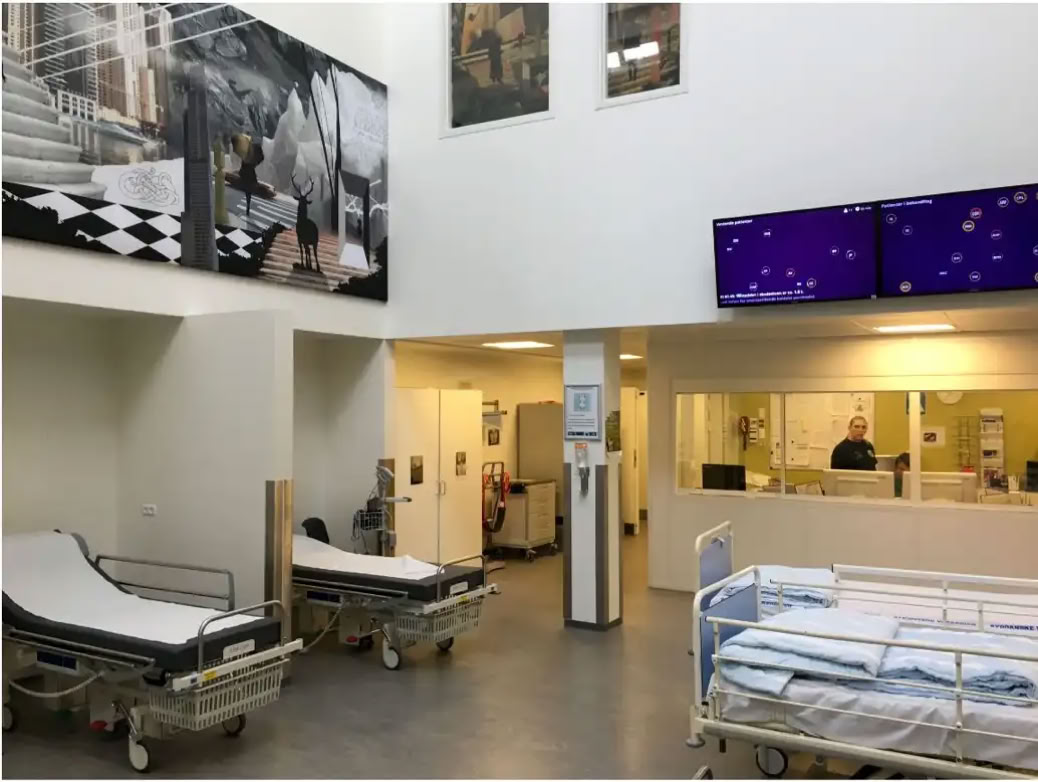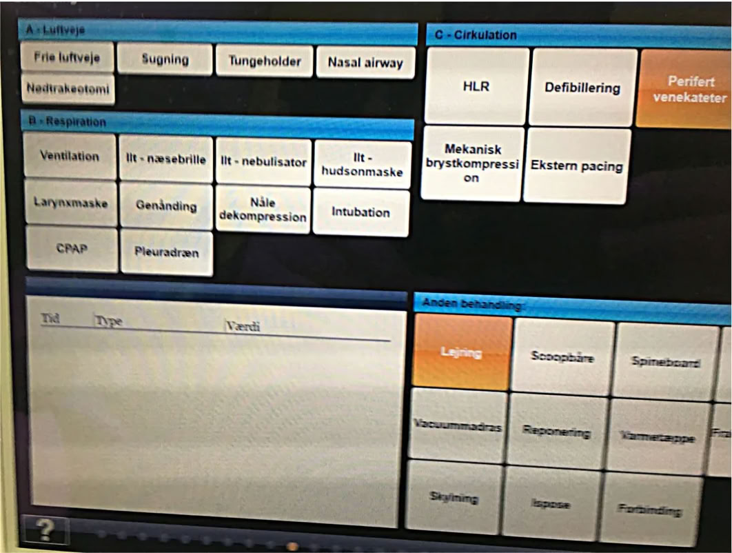 Wie in allen Kliniken werden über viele große Monitore (Touchscreen fähig) alle Daten z.B. über Zimmerbelegung und die mit Rettungsmitteln ankommende Patienten angezeigt. Die Patienten müssen hierbei nicht, wie in Deutschland üblich über Telefon oder IVENA, angemeldet werden, sondern erscheinen automatisch auf dem Monitor der Aufnahme der Zielklinik, die der Sanitäter im Tablett (PPJ) angibt. Das Aufnahmepersonal kann den Patienten auf dem Monitor aufrufen und dabei 1:1 lesen, was auf dem Tablett des RTW geschrieben wird, sowie auch die gesamte Patientenakte anzeigen lassen.Dies ist möglich, weil das Gesundheitswesen in Dänemark verstaatlicht und die Software vereinheitlicht wurde. Diese Programme müssen auch die Privaten Rettungsdienstunternehmen nutzen.