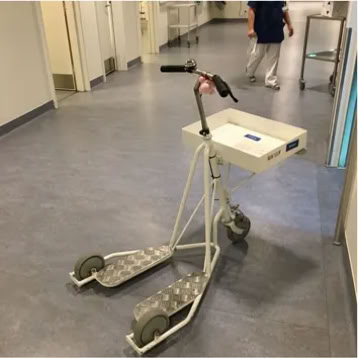 Als Gesundheitsvorsorge für das Klinikpersonal, stehen überall elektrische Bettenschieber und dreirädrige Tretroller rum. Die Tretroller werden vielseitig genutzt. Ob als schneller Notarztzubringer zur NEF Garage. Mit einemTablett mit etlichen Kanülen, Blutmanovetten und venöse Zugängen bestückt, mit dem die zuständige Blutabnahmeschwester über die Flure rast. Oder für speziell geschulte Pflegekräfte nur damit diese schnell von einer Station zur anderen zu kommen,