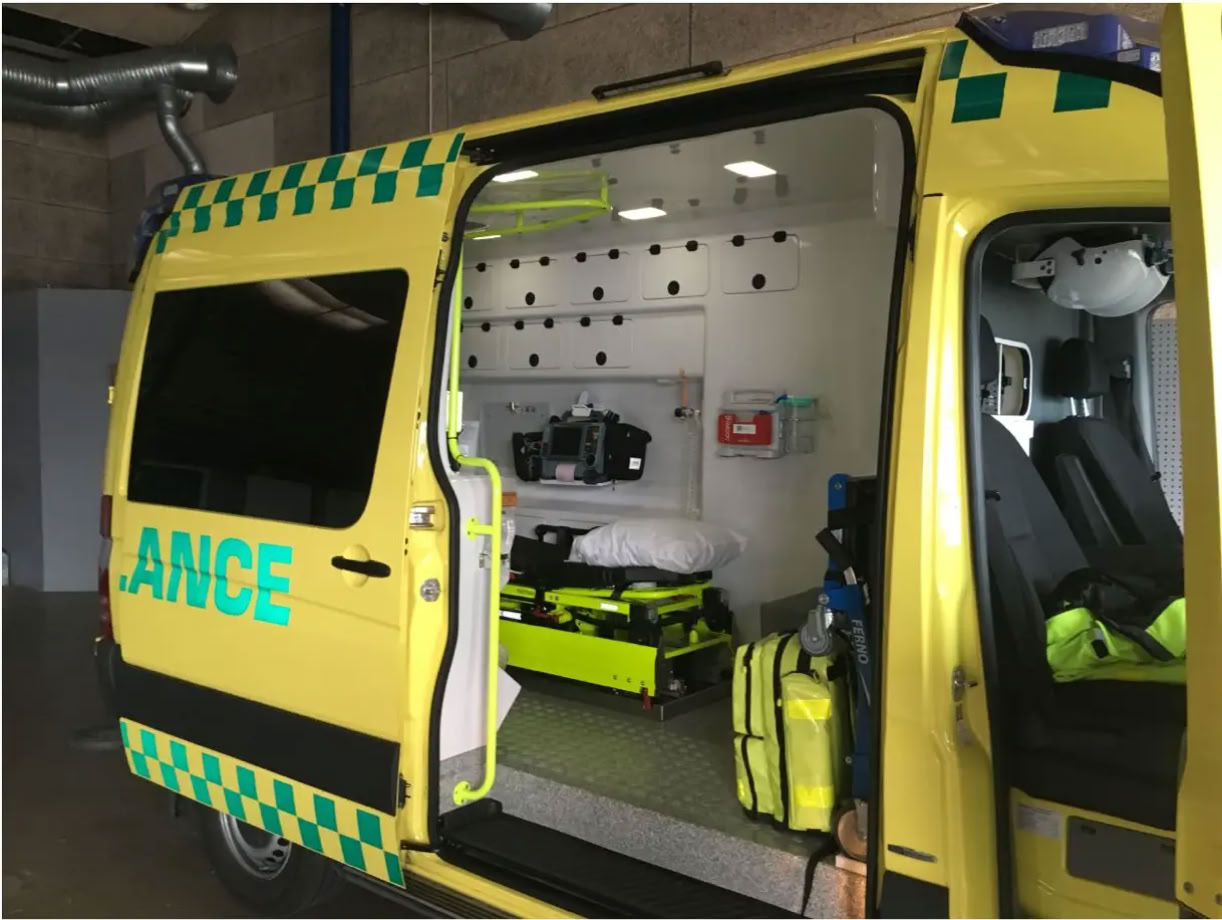 Blick in einen RTW von Ambulance Syd. Alle RTW's in der Region sind Identisch auf Basis eines Mercedes Sprinter aufgebaut. Von Ende 2019 bis 2021 werden diese, nach einer Ausschreibung, durch einen VW Crafterersetzt.