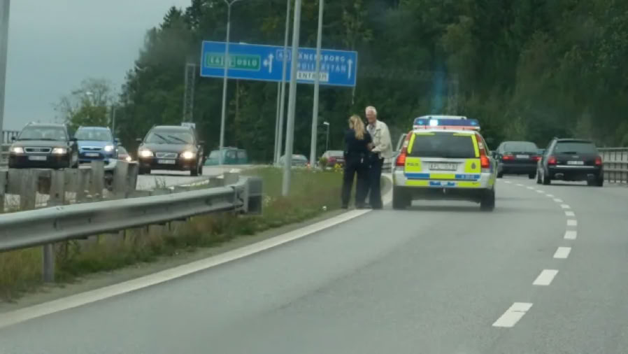 Stoppschildkontrolle der Polizei an einer Abfahrt der E6 in Uddevalla
