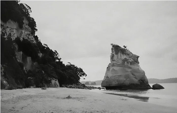 Schaut man durch den Cathedral Cove, einem natürlichen Tunnel, sieht man den diesen Felsen im Meer.