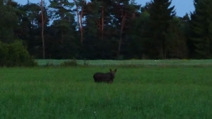 Am Zweiten Abend fuhr ich die Straße ein Stück östlich, um meine Zusatzbatterie für die Nacht zu laden. Nach 13 km entdeckte ich dann Elch Nr. 4. am Waldesrand. Bilder und Video zeigte ich sogleich meinen Womonachbarn, die zwar schon seit einiger Zeit in Schweden unterwegs waren, aber noch keinen Elch zu Gesicht bekommen hatten. Wie auch, wenn man Abends nur im Womo hockt.