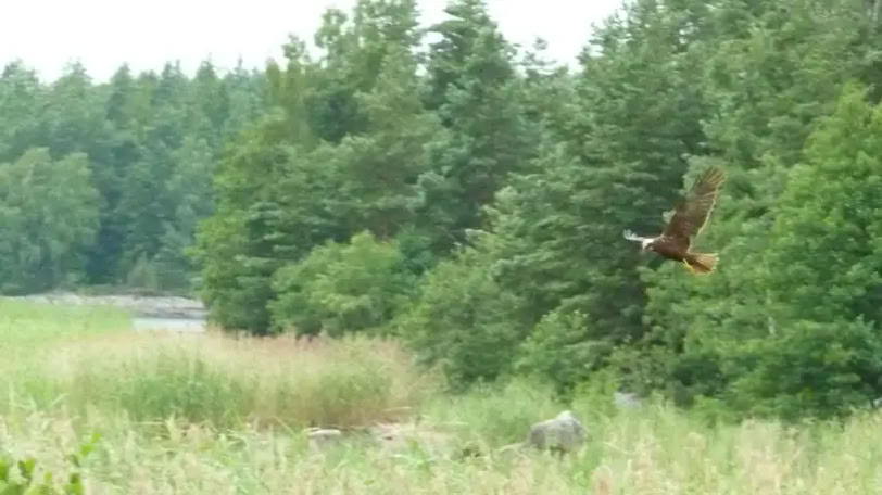 Ich suchte auf der Straßenkarte nach einen Badeplatz und steuerte einen Platz bei Rud an der Ostküste an. Eine richtige Badestelle ist hier nicht mehr zu finden, aber übernachten auf dem Waldparkplatz der Fischer ist möglich. Das Seeufer ist mit Schilfzugewachsen, sodass man nur am entlegenen Bootseinstieg ins Wasser gehen kann. Also nicht das, was ich suchte. Ich fuhr also weiter südlich zum Badeplatz nach S. Averstad. Dieser Abstecher nach Rud hatte sich dennoch gelohnt, denn ich konnte eine Rohrweihe bei der Jagt beobachten. Überhaupt überraschte mich die Halbinsel mit einer Vielfalt an Tieren, die ich so bisher auch noch nicht in Schweden beobachten konnte.