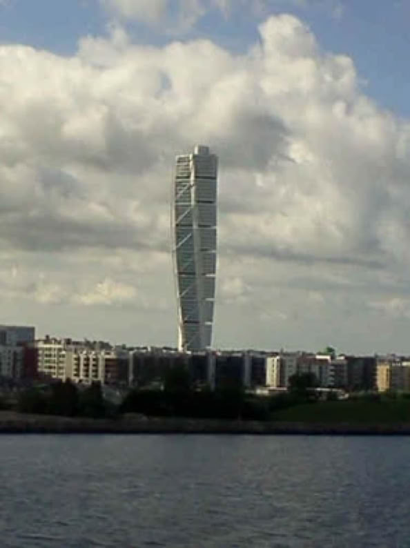 Schon weit vor der Einfahrt in den Hafen von Malmö kann man das Wahrzeichen der Stadt sehen, denTurning-Torso.