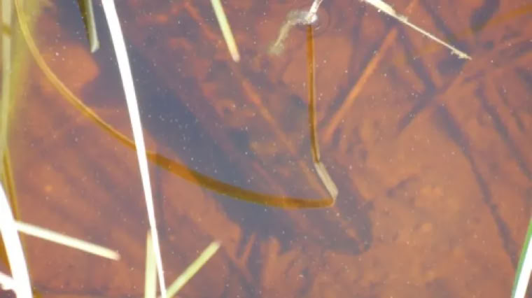 Beim Morgendlichen Frühstück auf dem Badesteg, entdeckte ich diesen Hechtgleich unterhalb des Steges. In knapp 50cm Wassertiefe lauerte er auf sein Frühstück.