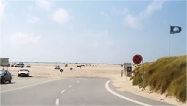 Vierspurige Straße zum Lakolk Strand. Ab hier sind es noch, Tideabhängig, 880 m bis zum Wasser.Bei Sturm können es auch nur 30m sein.